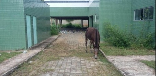 Enquanto isso, um cavalo pasta sossegadamente no interior de uma obra de UPA abandonada na cidade de Muriaé-MG (foto UOL).