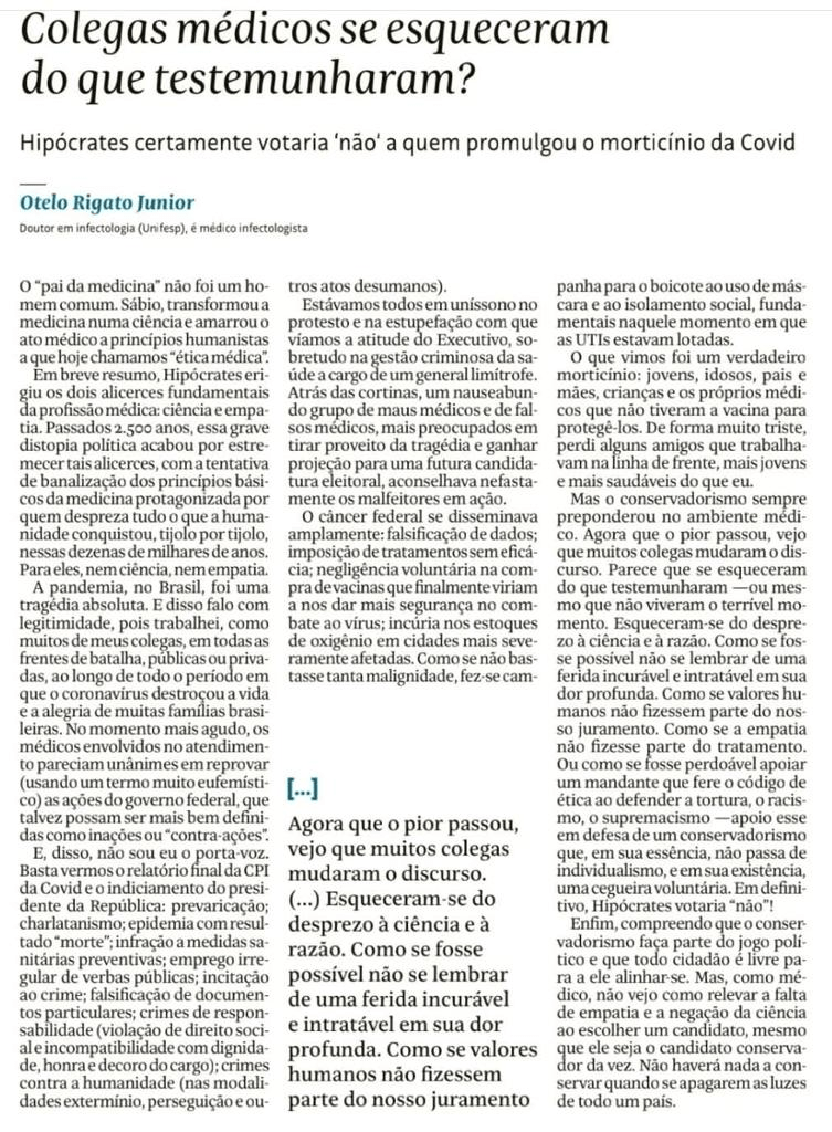 No meio de manifestos anódinos, como lançaram algumas entidades médicas na última semana, por ocasião do Dia do Médico, vale a pena trazer aqui o sentimento indignado de um desses profissionais. Acho que seria o mais adequado para o momento atual, quando coisas como genocídio e infrações éticas parecem se tornar naturalizadas.